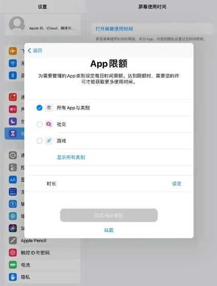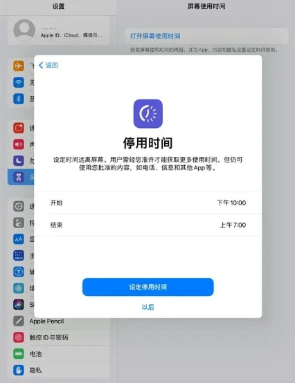 使用时间管控:设定每日可使用时长,以及在睡眠时间自动锁屏(例如22:00 - 7:00处于禁用状态)。