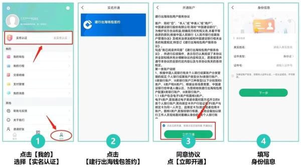1. 打开App后,按顺序点击【我的】→【实名认证】→【建行出海钱包签约】,按照App的提示阅读并同意“服务协议”,接着填写身份信息。