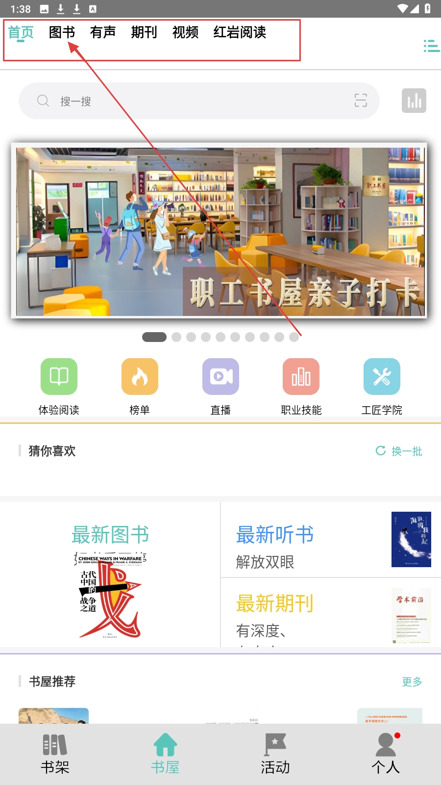 1. 开启应用后进入首页,点击顶端【图书】选项,进而进入图书页面。