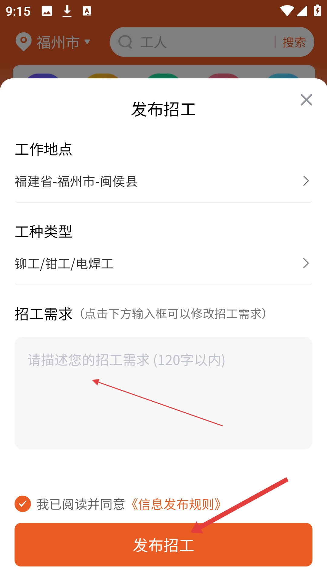 4、在招工需求框内填入相关内容,接着点击【发布招工】,完成发布操作即可。