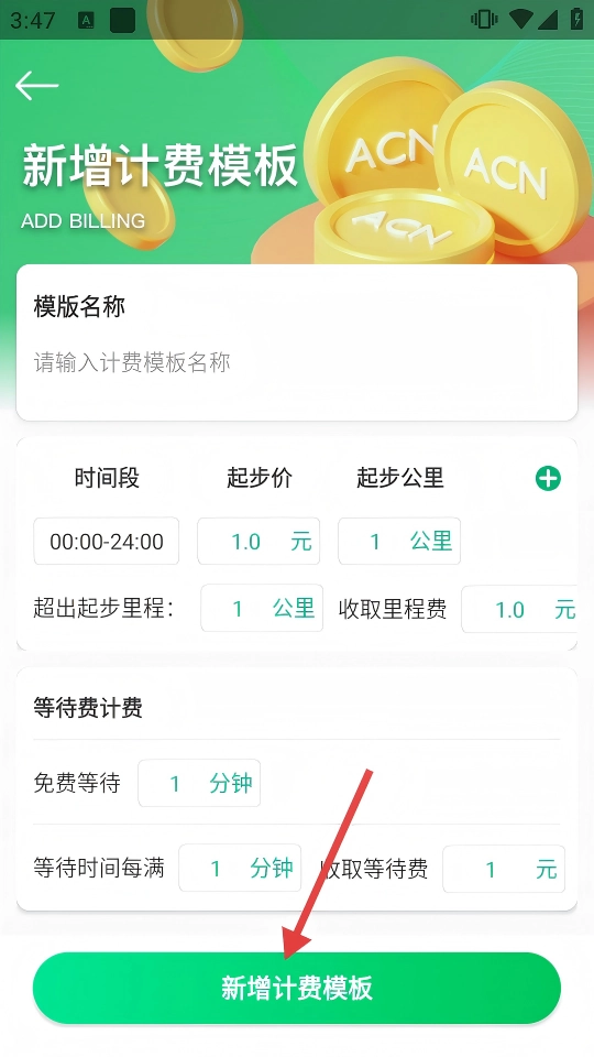 4、进入新增计费模板页面后,填写模板名称并设置好计费规则,接着点击页面底部绿色的【新增计费模板】按钮,即可完成计费模板的创建。
