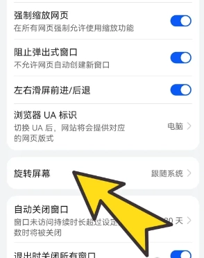 2、进入浏览设置界面后,找到并点击旋转屏幕。