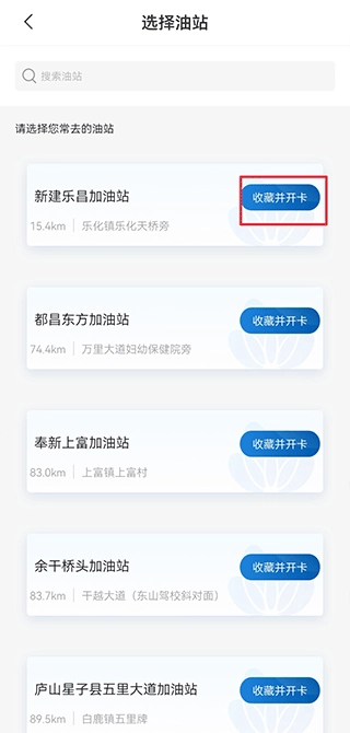 2、选择加油站后,点击收藏并开卡