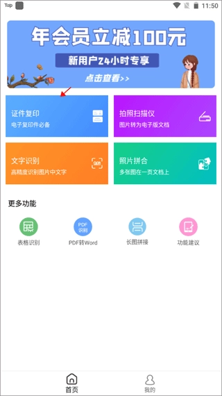 1. 开启软件并进入首页,点击页面上方的“证件复印”功能按键。