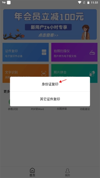 2. 页面上弹出一个小窗口,窗口中有两个选项,点击其中的“身份证复印”选项。