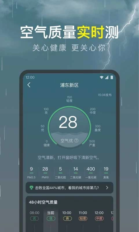 2、实时天气:通过动态背景进行展示,无论是温度、湿度,还是风力风向、空气质量,都能满足您的需求。