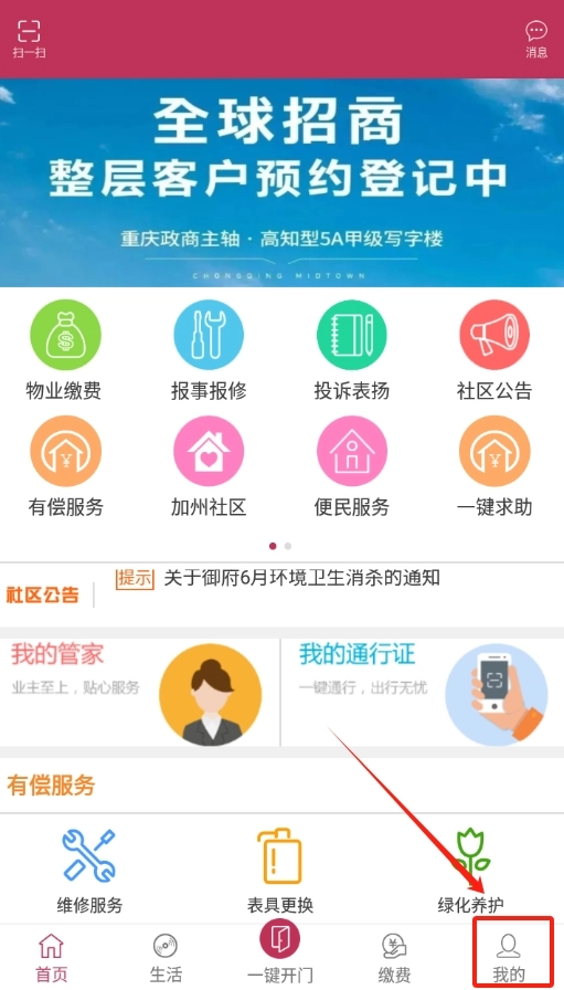 3、成功登录后返回首页,于功能列表中寻得“物业缴费”,点击进入即可缴纳物业费。
