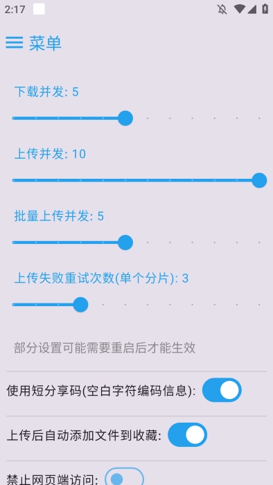 答:用户可进入App页面,点击右上角“菜单”按钮,接着选择“设置”,以此对上传并发数量等功能进行调整。