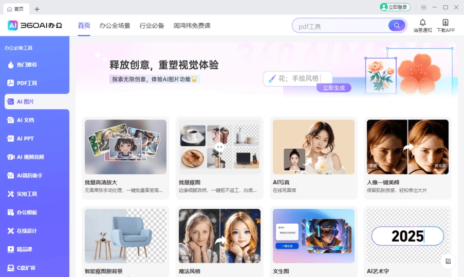 嗨,亲爱的用户!欢迎来到360AI办公,这是一个充满活力的办公效率平台,它将办公工具与创意内容模板完美融合,是一站式的服务平台。360AI大会员拥有200多项办公权益、30万+模板资源以及30余种AI图片工具。现在,快来开启全新的办公方式吧,点击即可体验哦!