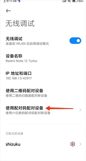 3、开启USB调试,进入无线调试并开启,点击选择使用配对码进行配对。