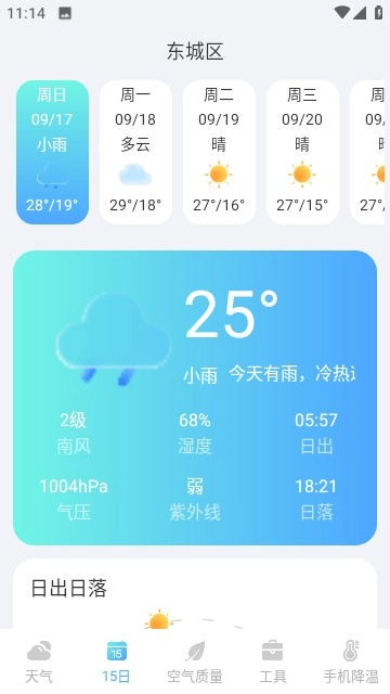 4. 15天预报:详细呈现15日的天气状态,包括温度、风向、空气质量、风况等信息。