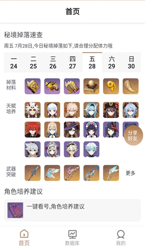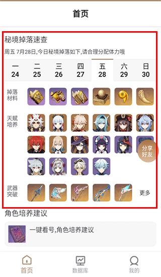1. 在首页,玩家能够查看秘境一周的掉落材料状况,从而更合理地分配体力。