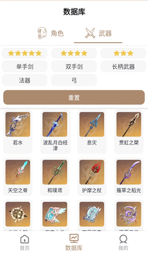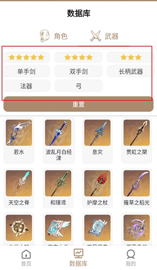 3、武器的各项数值同样可在数据库中查看,查找方式依旧是依据星级和武器类别进行。
