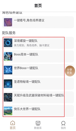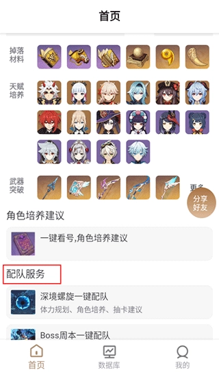 3. 根据每个玩家各自拥有的不同角色池,提供针对性的配队服务。无论是深境螺旋、周本Boss,还是圣遗物秘境、武器突破材料秘境、天赋技能提升材料秘境,都能实现一键配队,并对队伍阵型进行详细解说与指导。