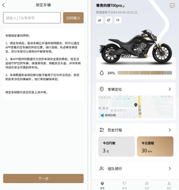 车辆绑定操作步骤如下:首先登录奔达平台,随后进入车辆管理界面,根据系统指引填写车架号等相关信息完成绑定。现阶段,该功能主要适用于燎700 Pro这款车型。