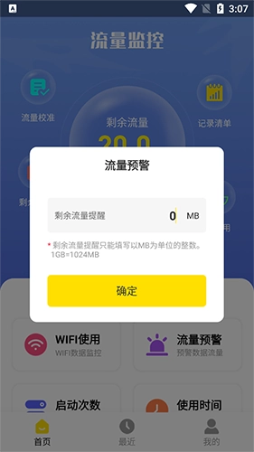 在这里输入剩余流量提醒的数值,当流量剩余量低于这个设定值时,系统会及时发送提醒,防止流量超额使用。