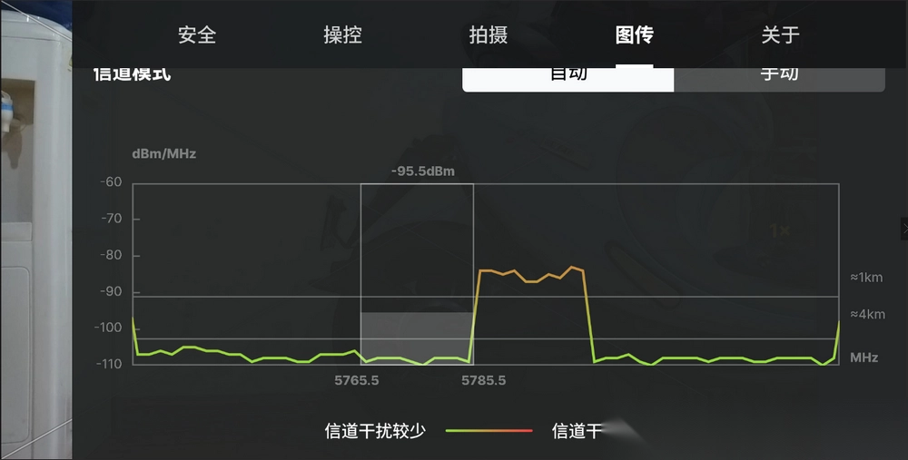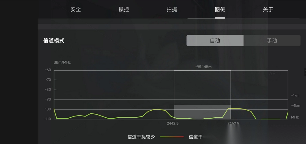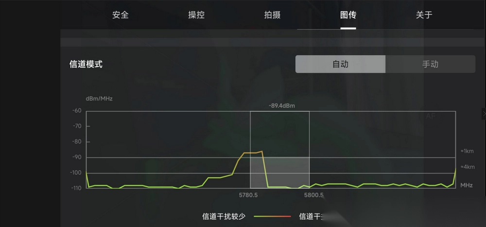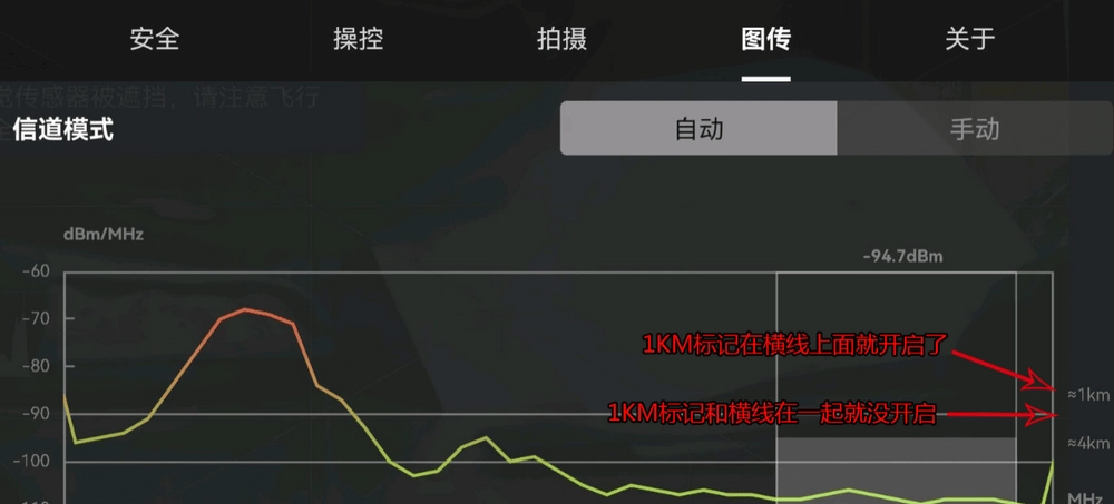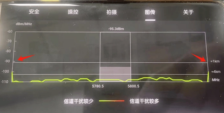 启动对应的飞行控制应用后,进入图传参数显示页面,留意信道模式的动态变化情况。此时可以看到,代表1公里距离的标识会移动至-90分贝毫瓦的基准线之上——而在未进行相关优化前,该标识仅处于这条基准线的邻近位置。