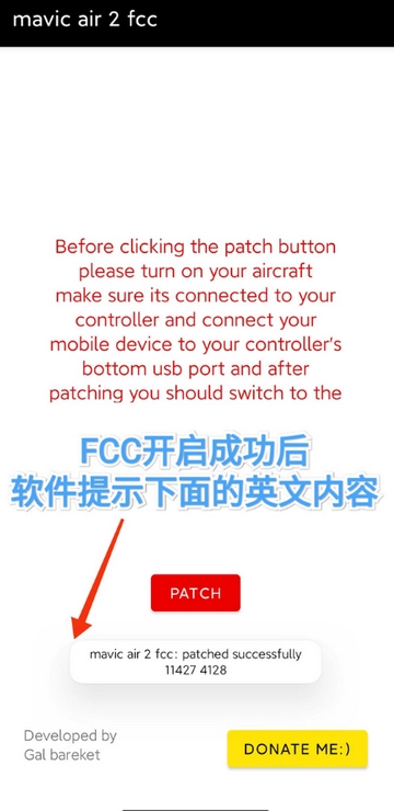 先把相关软件安装到手机上,接着启动Mavic Air 2对应的FCC程序,找到并点击界面上的“PATCH”按钮。等软件弹出“patched successfully”的提示语,同时显示出一串数字时,就说明补丁已经成功完成了。