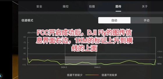 在正常启动DJI Fly应用后,进入“图传”信息页面,可留意到右侧传输选项区域的状态变化——原本位于横线下方的1KM标识会移动至横线之上。