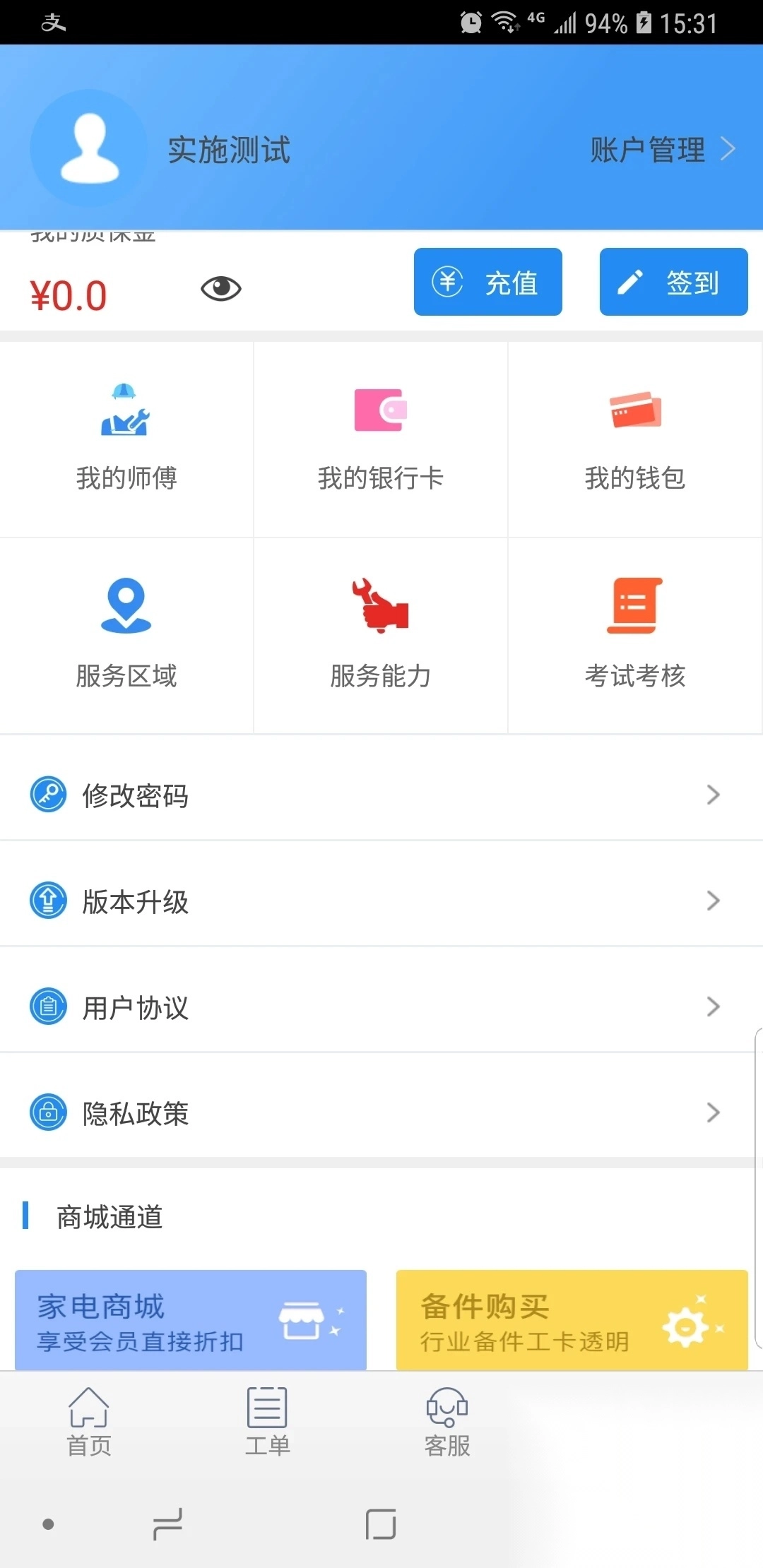 进入个人中心页面,浏览各类服务项目及工程师资料,还能在线维护银行卡与钱包信息。