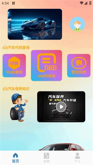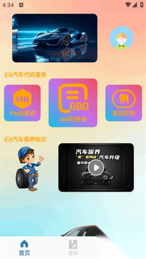 启动软件后,主界面上能找到车辆编码检索功能以及汽车维护相关的常识内容。