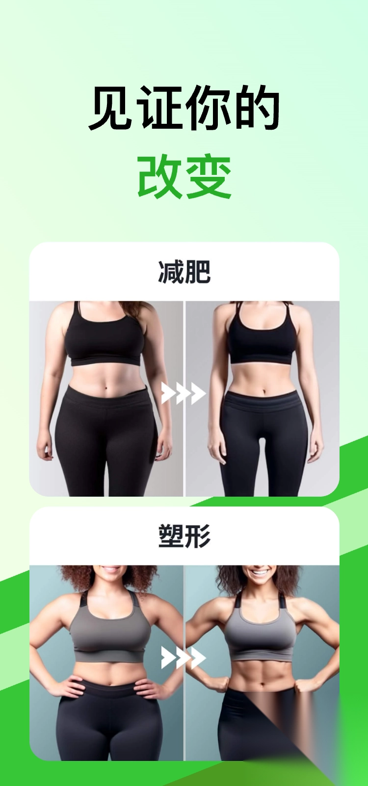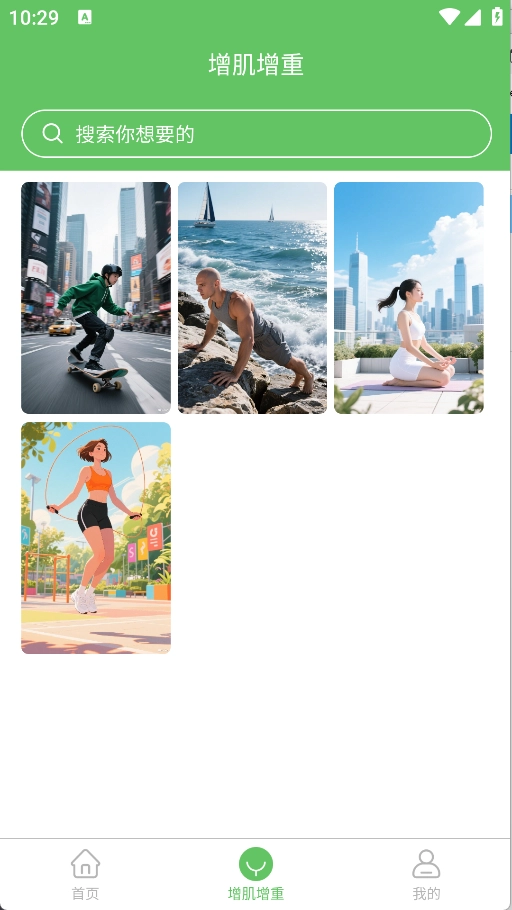 在首页中提供了塑形减脂、增肌增重、瑜伽等版块;