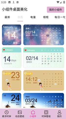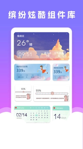 在小组件美化库中,您可以自定义导入图片,每天都能看到不同的图片。您还可以切换多种字体样式和颜色,让您的小组件更加个性化。您可以选择上传本地图片作为小部件背景,还可以选择不同功能的小组件,如时钟、日历、倒计时、纪念日、每日一句、电量等。