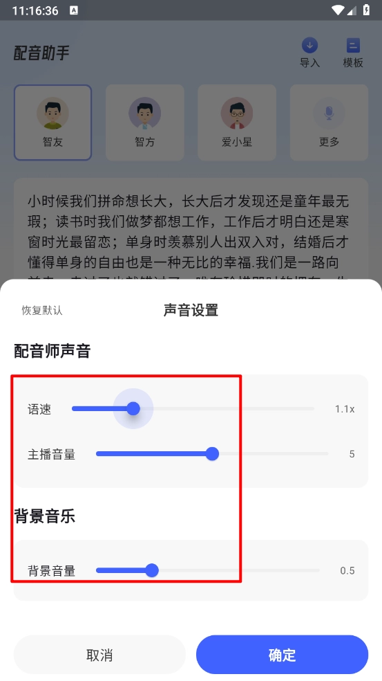 接着进入声音设置界面,选择语速、主播音量和背景音量,最后点击“确定”按钮。