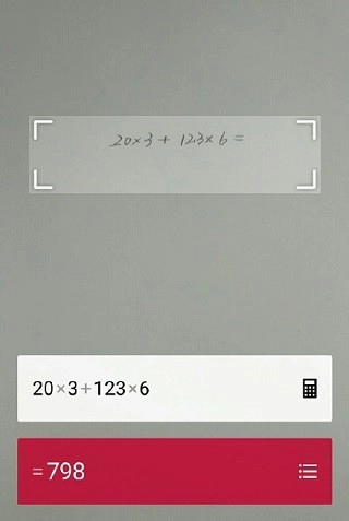 打开应用后,用户只需把镜头对准给出的算式,系统就会自动识别该算式并在屏幕上显示出来,进而算出对应的答案。