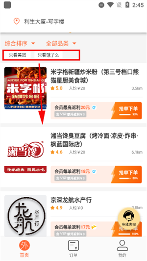 确定好位置后,往下滑动页面就能看到周边的美食推荐。要是你是美团或者饿了么的会员,可以点击分类选项,筛选出对应平台的商家,这样能享受到更大的优惠力度。
