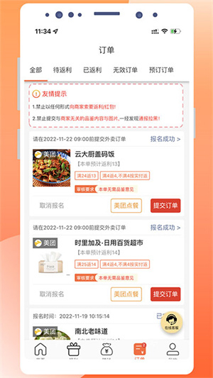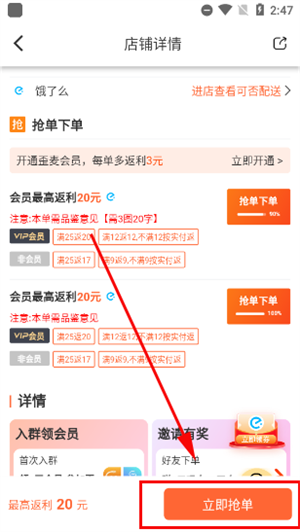 挑选好您想品尝的美食后,点击下方的抢单按钮就能参与活动,成为会员还能享受更高的返利福利哦