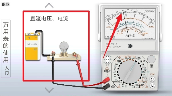 在直流电压、电流模块上,可模拟对电池与电路电流进行测量,电路连接妥当后就会显示出相应数值。