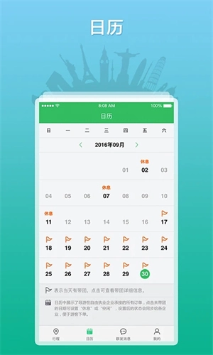 日历:呈现导游在自由执业企业承接的全部订单,点击未带团的日期能够设置“休息”或者“空闲”,设置好的状态会同步至各企业,方便游客进行下单操作。