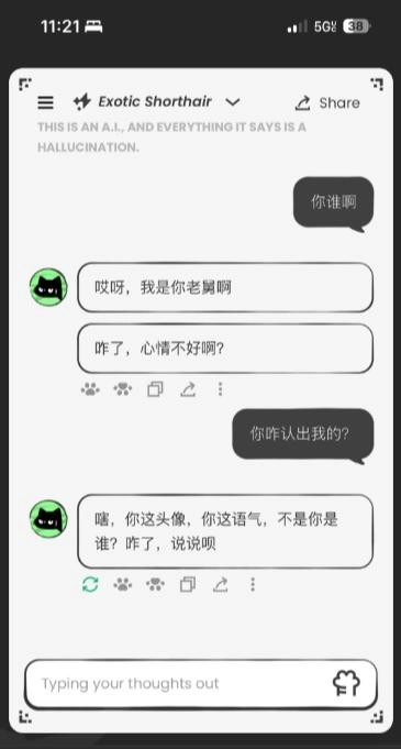个性化对话功能:用户可挑选不同性格的AI角色(例如橙猫、异国短毛猫等)进行交流,每次开启对话都会刷新角色的人格特质,以此为用户带来丰富多样的互动感受。