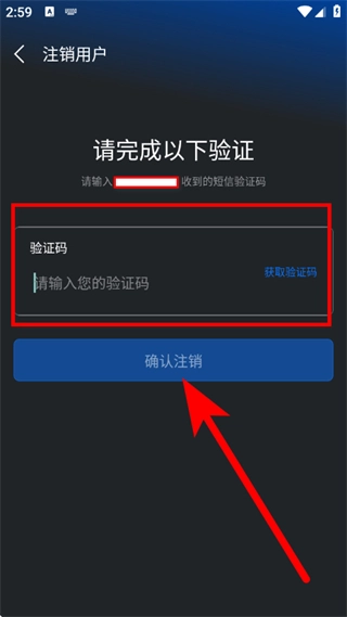 在账号注销页面,填写验证码后点击确认注销按钮,即可完成账号注销操作。