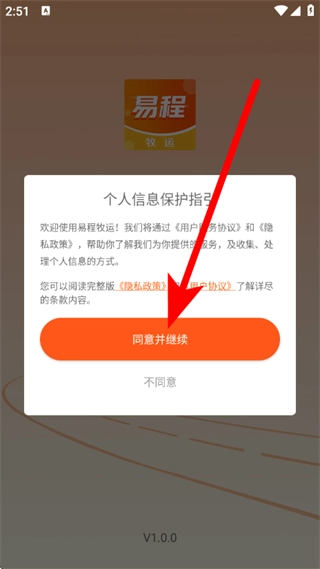 打开易程牧运应用后,会弹出提示框,点击“同意并继续”按钮,即可进入首页。