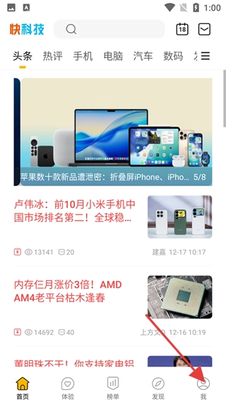 在“快科技”首页,点击底部导航栏的“我”,就能进入个人中心页面。