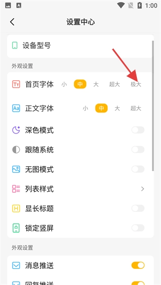 你可以在设置中心的“外观设置”板块里,找到“首页字体”这个选项,然后挑选你想要的字号,比如“极大”。