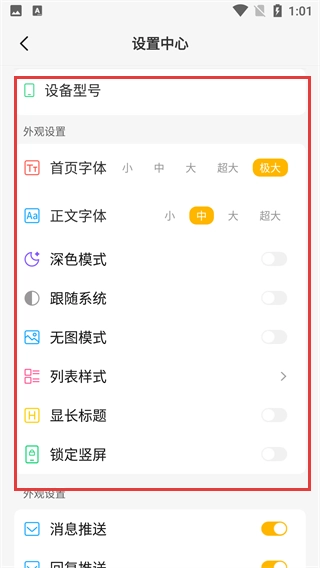 同时还能对“正文字体”“深色模式”等外观选项进行调整,从而完成个性化的界面配置。