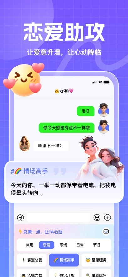 恋爱聊天时总是紧张,TA说的话不知道该怎么接?职场消息处理起来让人头疼,领导突然一句“加个班”,怎样回复才合适?妙回输入法,是一款专门为解决社交沟通问题设计的智能键盘输入法软件。