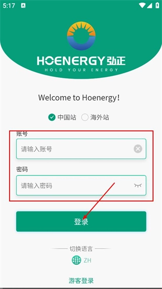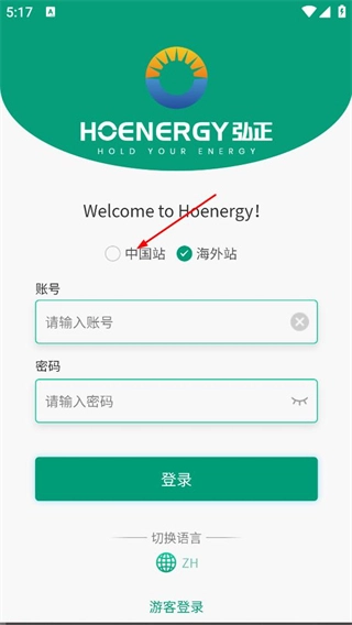在弘正登录页面,选择中国站选项,切换到中国站登录界面。