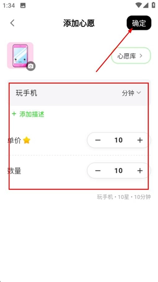 在添加心愿的页面,完成时长、单价等信息的设置后,点击确定按钮即可完成心愿的添加操作。