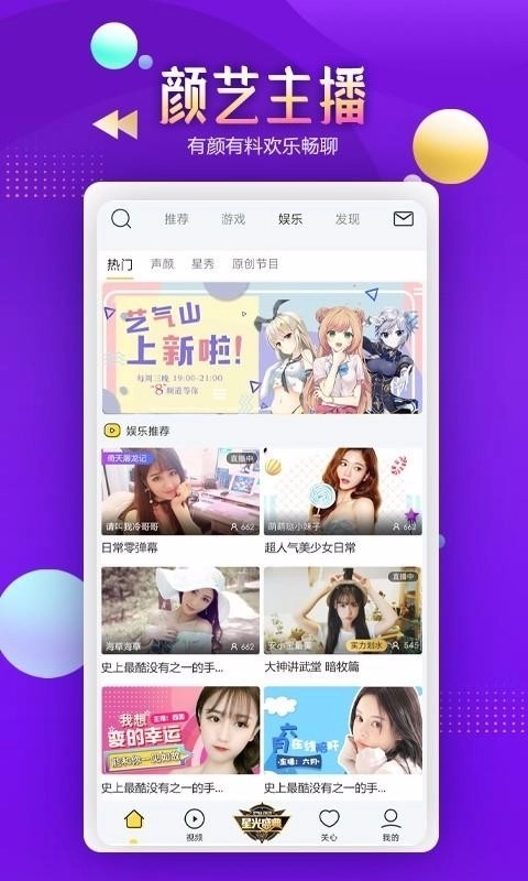 艺气山把直播间划分成了推荐、游戏、娱乐、发现等不同的板块。