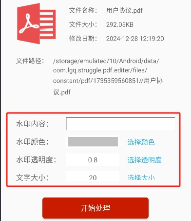 您可以先对水印的内容、颜色、透明度等参数进行设置,完成后点击“开始处理”按钮即可。