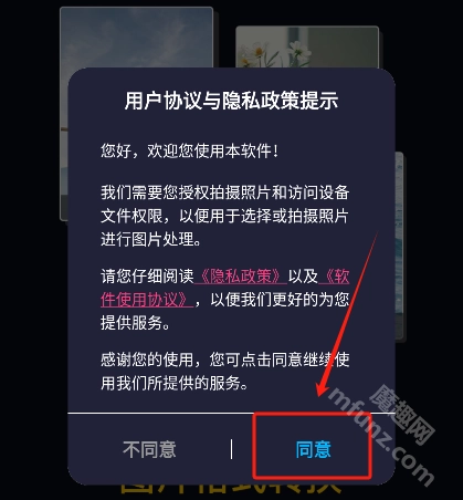 首先在魔趣网(mfunz.com)找到并安装图片格式转换软件,随后点击“同意”进入软件界面。