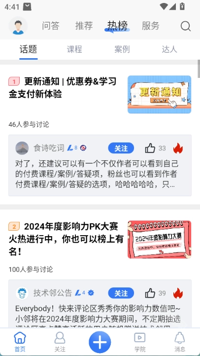 支持个性内容收藏,包括技术课程、帖子和话题。