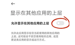 答:点击“去开启”或者“前往设置”,进入悬浮窗权限的开启界面,找到“在其他应用上层显示”这一选项,然后把它开启。