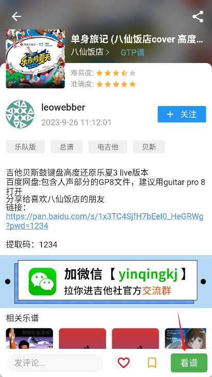 点击页面右下角的“看谱”功能,查看乐谱内容。