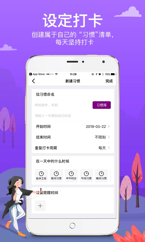 习惯库是这款软件的特色功能之一,里面涵盖了多种养成好习惯的计划,像早睡早起、健康饮食、学习读书、运动健身等都包含在内,方便你挑选自己感兴趣的习惯养成目标。