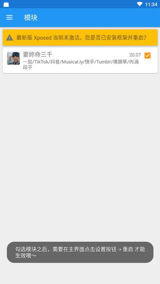 现在开始激活Xposed模块,首先在VirtualXposed里启动Xposed安装程序,接着切换到模块页面,最后勾选需要启用的模块。